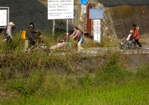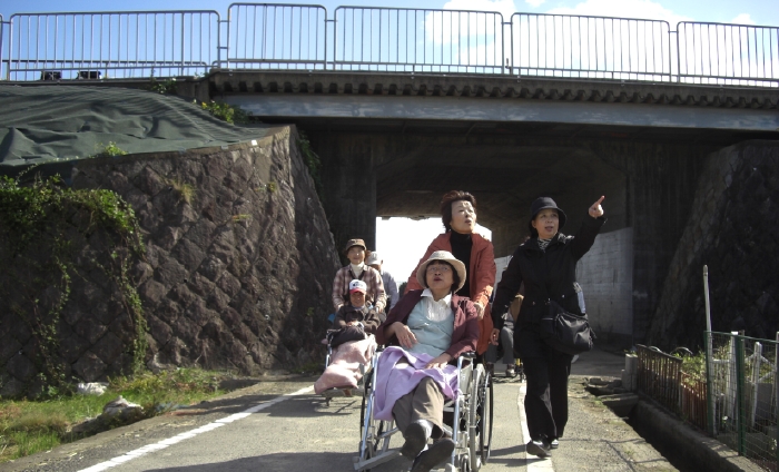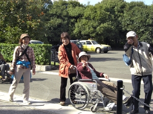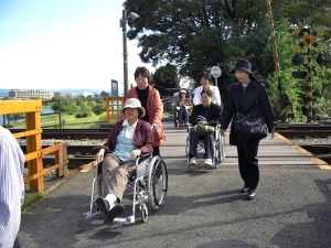 そんな時、車いすの扱いに慣れておられる島田さんのご主人が騎手を交代して下さり、簡単に前向きのままで下れました。前輪を高く上げて搭乗者の視線が平行になるようにすることで身体も落ちないし搭乗者にも不安を与えないそうです。でも騎手に体力や技術が必要です。また少しの傾斜でも車いすは低い方に向かって動き、道路が平らでなく蒲鉾型なことを改めて意識します。