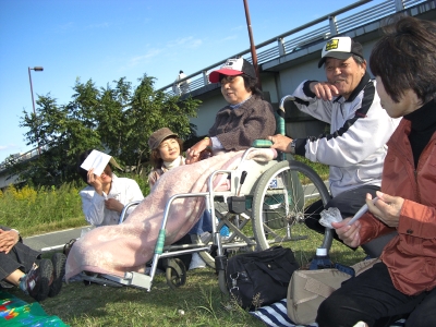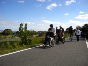桂川河川敷の遊歩道は、時折、サイクリングする人、ジョッキングする人とすれ違います。車いすからの車窓(?)は、秋の野菜、草花が懐かしくも珍しくも感じ、久しぶりにゆったりとした時の流れを感じましたが、やっぱり下り坂は高度な技術がいるので不安でした。