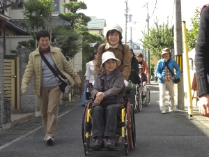 さて、車いすに乗る立場と車いすを押す立場は随分違いますが、今回はその両方を体験してみるという実習でした。一番違うのが立つ人と座っている人の目線でしょうか。押す人の声のかけ方、段差への気配り、コミュニケーションがとれているのかどうかで乗り心地も随分違うという意見もでました。また、押す方にとっては歩道であっても段差やデコボコの道、排水のためか斜めになっている歩道が京都ではまだ多く、車いすではまだまだ歩きにくいのが現実のようです。誰もが何時かはお世話になる可能性のある車いすですから、車いすごとの一人の人間としてより歩きやすい道路をつくって頂きたいと思います。