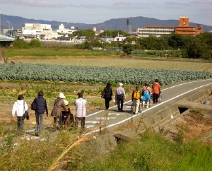 島田さんご夫妻の案内で、桂川縁の散歩コース、田園あり山ありで、のどかな気持ちにさせて頂きました。少し残念に思った事は、上り下りの坂はありましたがほとんど平坦な道だったので、学習する面ではすこ〜し物足りない気がしないでもないですが、一歩でも進む事に意義がありますもんね。
