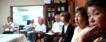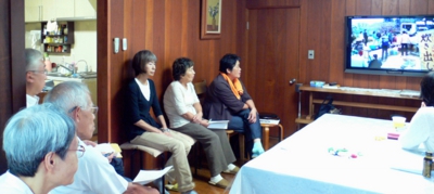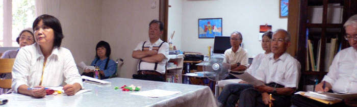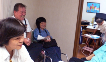 台風の雨の中 車いすの島田さん、92歳の最高齢の森さんをはじめメンバーが集まってこられる。きつい雨の中、この定例会が楽しみ・・・と集まってこられる。