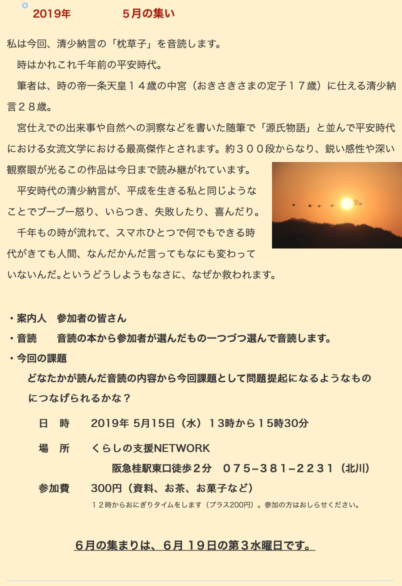 今回も音読をきっかけに先回の清少納言の「枕草子」と重ねて二人の平安女子の生い立ちや生き方など少しではありますが知ることができ学ばせてもらいました。